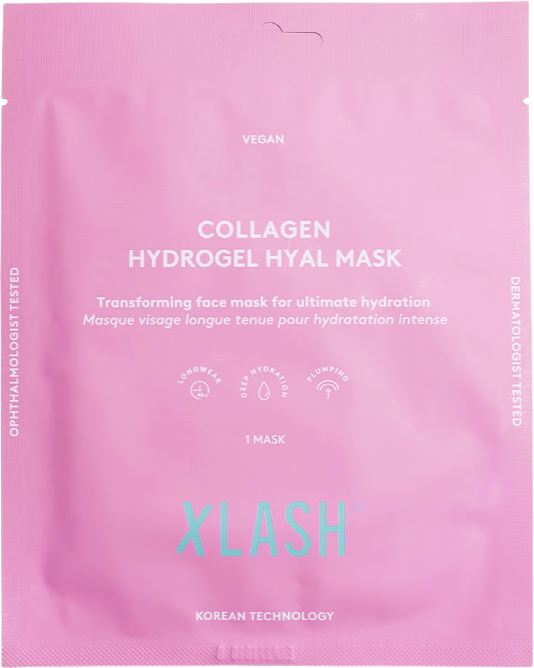Xlash har skapat en lyxig mask av hydrogel som är delad i två delar för att säkerställa en skön passform oavsett formen på ansiktet. Den kombinerar kollagen med hyaluronsyra för att ge en omedelbar utslätande effekt på fina linjer. Materialet sänker hudens temperatur, vilket dämpar svullnad och ger en piggare blick.